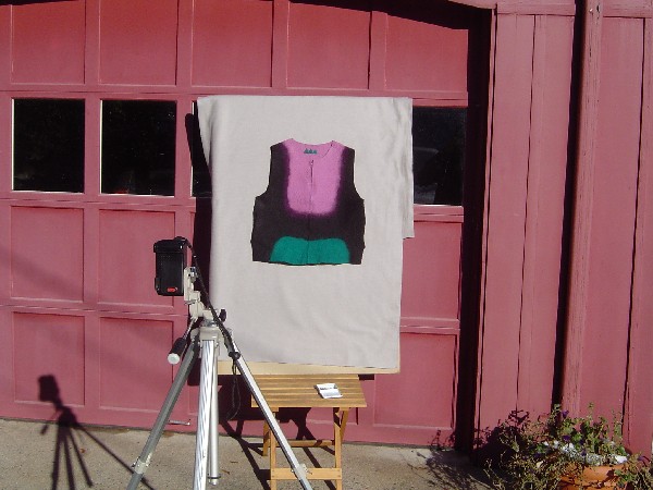 On the left is a professional photo shoot on a misty August Sunday. My husband came to watch and volunteered to hold the umbrella. Richard Bergen is the photographer and Julia Herwood the model. On the right is the amateur photo shoot in my driveway. A sheet of homosote is draped with light gray felt and the pieces are put on with pins. It works best on a hazy day when there are no sharp shadows.