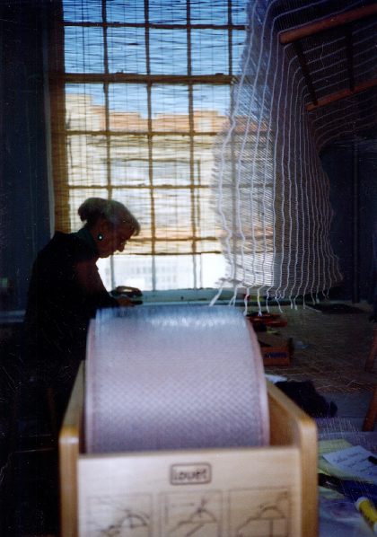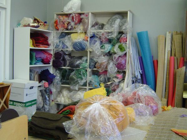 This is my studio on a work day. The Backyard Coat is laid out on the right. The space is about 15' x 20' and has a sink. My work table is 6' x 8½' which is slightly less than I need to lay out the body of a coat, all in one piece. So the mat hangs over the edge.