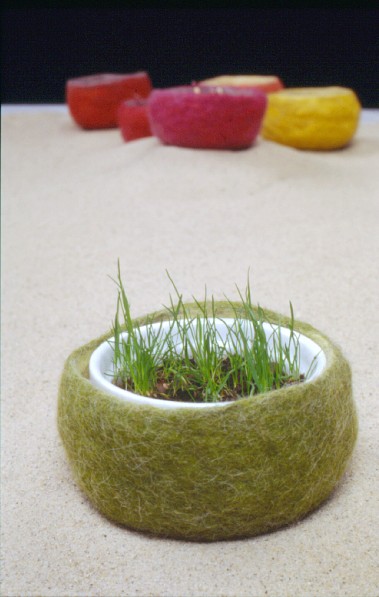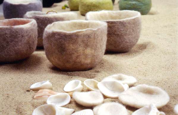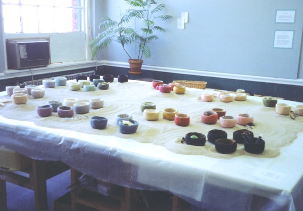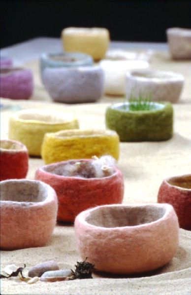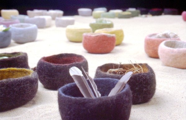 Viewers see a display of fifty bowls, each formed of handmade felted wool. The bowls are arranged on a bed of sand, just as important to the overall effect as the bowls. A third of the bowls are empty; one third contain material from the natural world; one third contain manmade artifacts. Each one is designed for a distinct emotional or spiritual response on the part of the viewer. Beyond the individual bowls the groupings of the bowls and the display as a whole leave a strong impression.