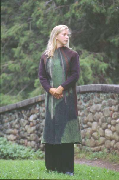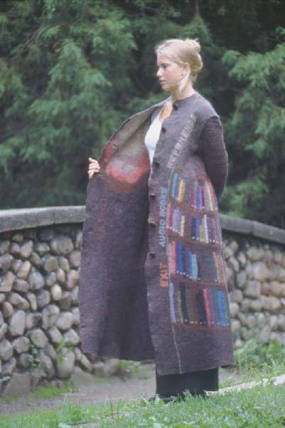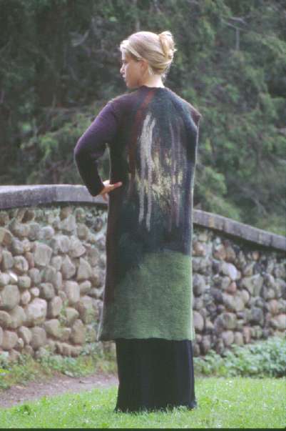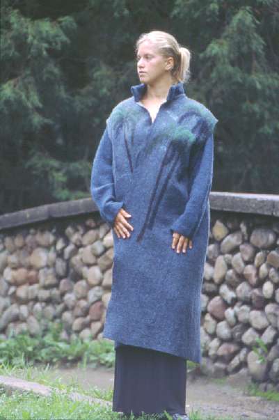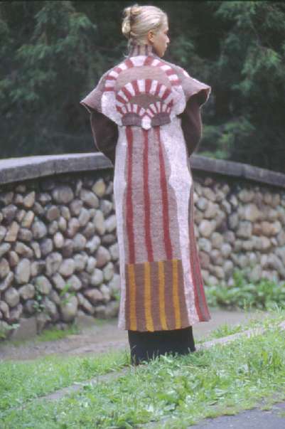 The coat bodies are wet-felted. The motifs are cut from pre-felts and laid onto the fleece before wet-felting. The sleeves are knitted. All are 100% wool. Photos: Richard Bergen. Model: Julia Herwood. | |||