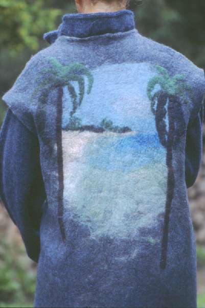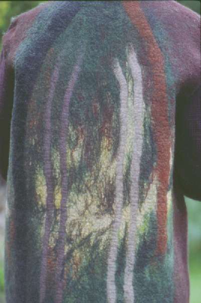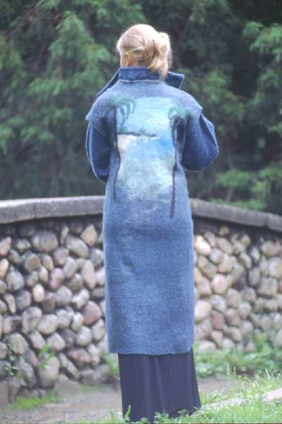 These coats are a series titled "Sanctuary." We find sanctuary in places of retreat, shelter and spiritual uplift. Each coat represents a place of refuge and renewal, much as a felt coat shelters and comforts the wearer. Here sanctuary is interpreted in coats, made to envelop the wearer, to offer protection from the elements, as well as solace, comfort and renewal.