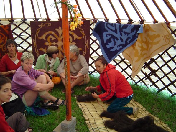 I studied Kyrgyz crafts. On the left we are making samples of shirdak, a Central Asian carpet made in layers of felt, elaborately stitched together. On the right is chiij, matting made of reeds wrapped with colored wool and woven together. |