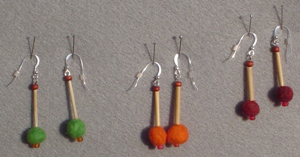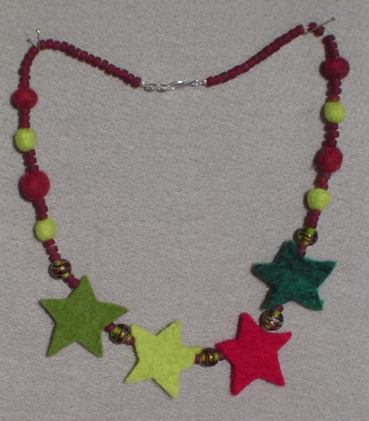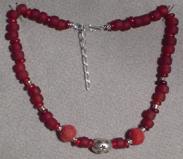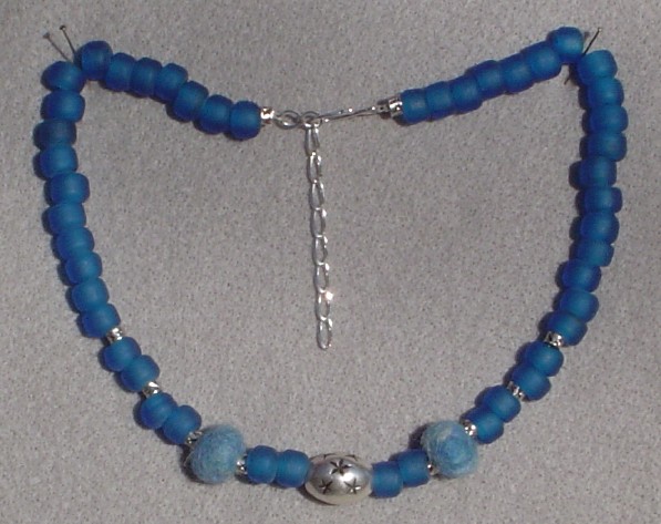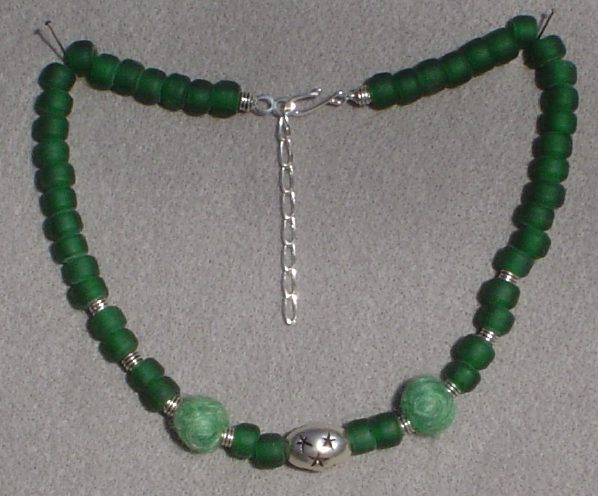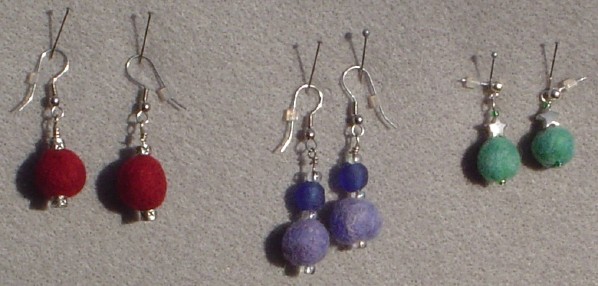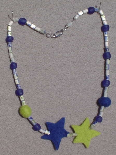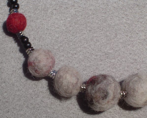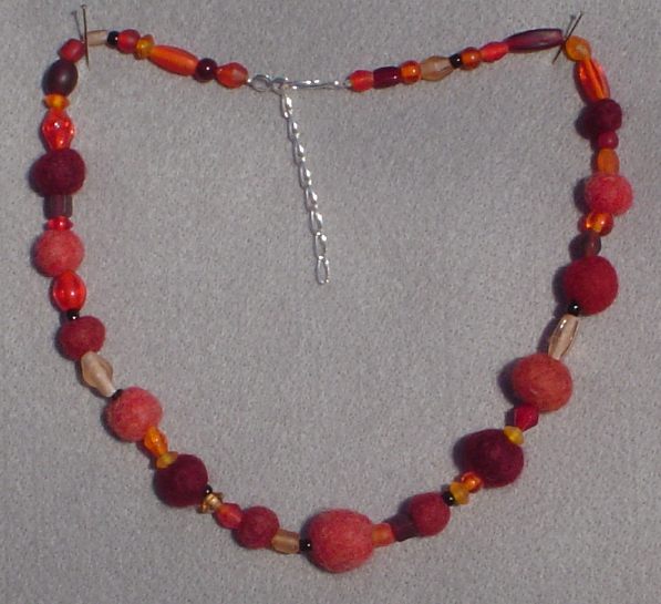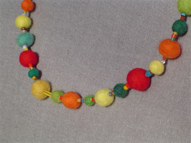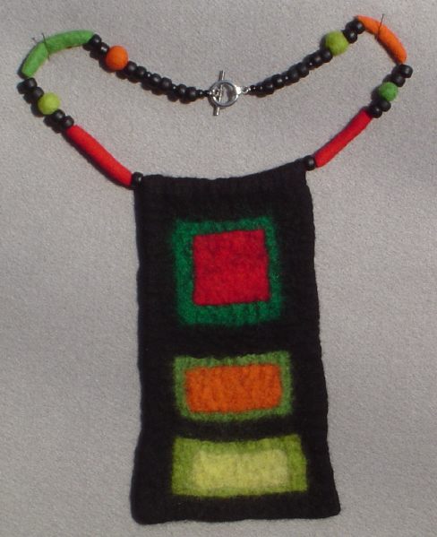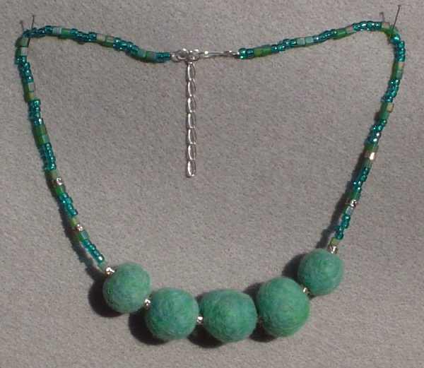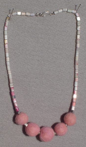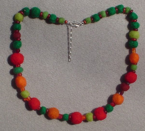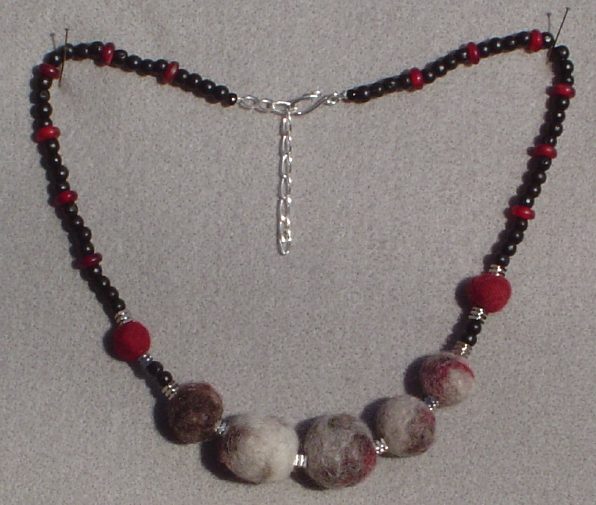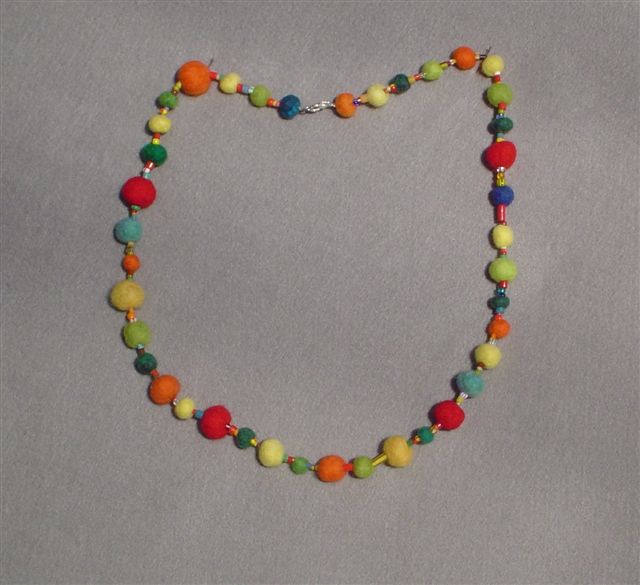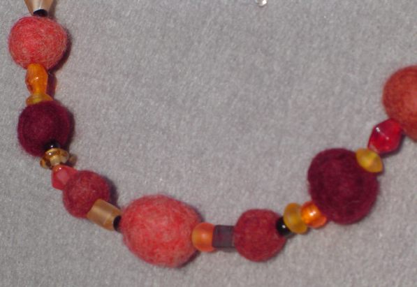 Each of the necklaces includes some felt pieces, all wet-felted. In addition there are glass, ceramic, and silver beads and silver closures. |