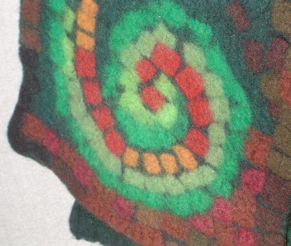 The purses are all wet-felted, some with inlaid stripes or motifs. The one on the left has feathers felted into it. Several are beaded. The straps are made of twisted yarns and sewn in. | |||||||||