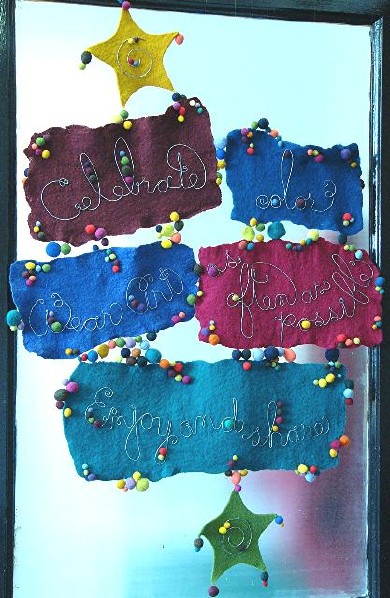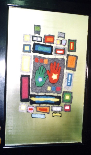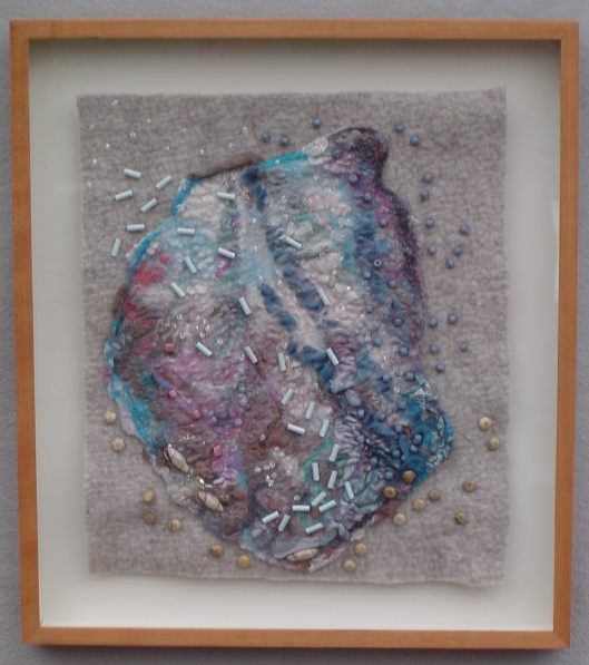 The shaped piece is strip-felted, i.e. strips of cloth freely interwoven with fleece and wet-felted. I made it in a class with Polly Stirling. It is mounted on a sheet of handmade felt and beaded. I made two pieces for the door to my studio. The one on the left, the first, was bought by a massage therapist.